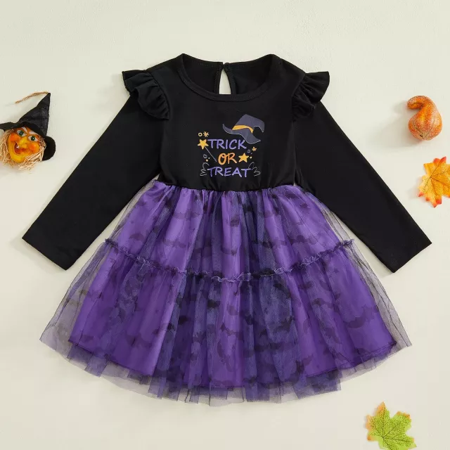 Make this Halloween magical with our Toddler Girls Witch Hat Print Tulle Dress. Designed for ages 2 to 7 years, this enchanting dress brings together festive fun and everyday comfort. With its round neckline, ruffled long sleeves, and whimsical witch hat print, it’s the perfect outfit for parties, trick-or-treating, or just getting into the holiday spirit.